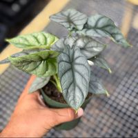 The 'Alocasia Silver Dragon' is a popular and sought-after houseplant known for its unique, silvery-green, heart-shaped leaves with dark green veins that resemble dragon scales. This compact plant is a hybrid of Alocasia baginda and is native to the tropical rainforests of Borneo, Indonesia. It is prized for its ornamental foliage and is a popular choice for indoor plant collections and terrariums.